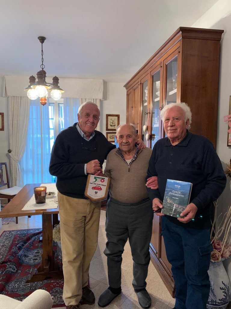 Nel pieno spirito dell’attenzione alle persone che da sempre contraddistingue il Fiat 500 Club Italia, è parso naturale portare il saluto di tutti i soci a Pippo di Paravenna, che compirà 101 anni nell’ottobre 2025 e che cantò ai primi raduni del Club. Agostino ha accolto gli amici nel suo appartamento ad Albenga, dove Domenico e Francesco gli hanno mostrato alcuni video del raduno del 1986.
