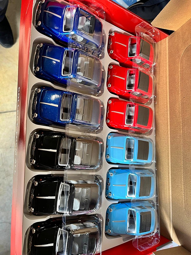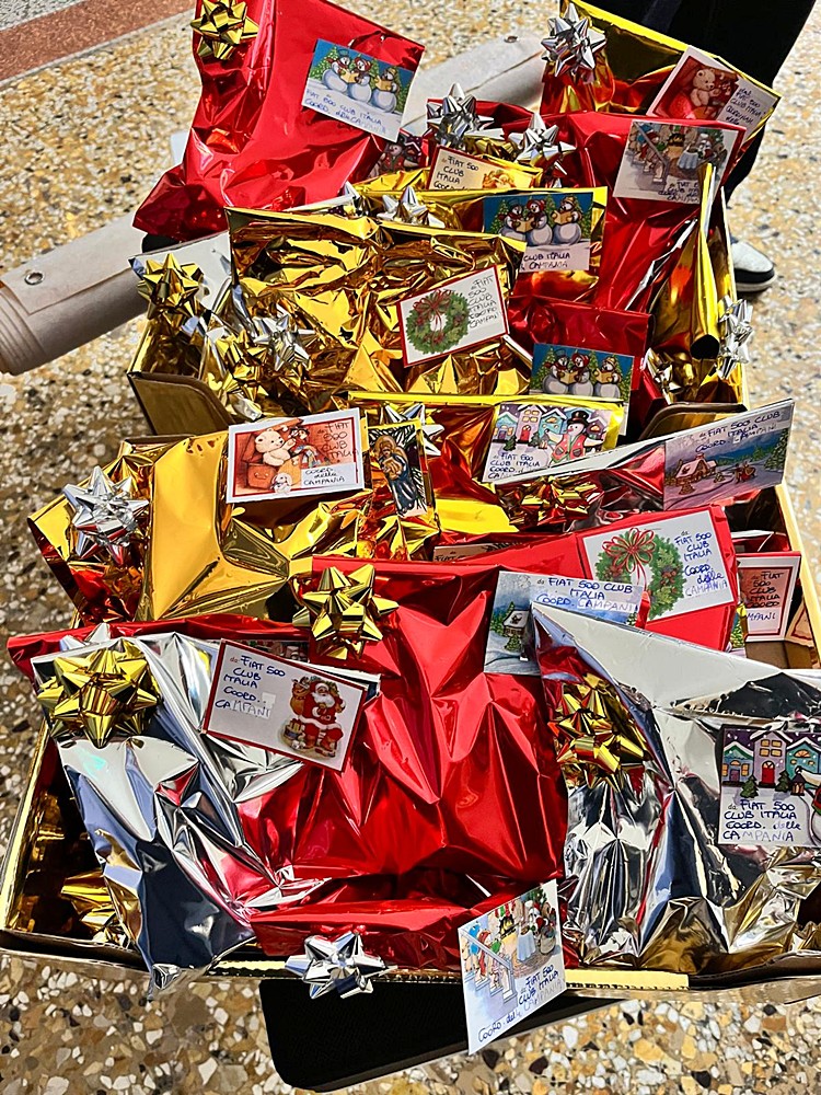 So di certo di non avere il tempo di girare i negozi, ma quando si tratta di bambini e delle nostre 500, qualcosa ci inventiamo. Chiedo a Mimmo di inviarmi la foto e la marca del modello per non sbagliarmi e, mentre le guardo, mi viene l’illuminazione. In passato anche noi abbiamo donato modellini (di una marca e di un prezzo diversi) in occasione delle nostre uscite con i ragazzi autistici al parco giochi di Edenlandia. Quella volta, facendo il giro con gli amici degli amici, ero riuscito ad arrivare ad un grossista di giocattoli che mi aveva favorito, quindi… tentar non nuoce: trovo il numero di Enzo, gli invio le foto dei modelli e mi dice che non li tratta, ma conosce il rappresentante. Altro giro di telefonate, i modellini sono ordinabili in scatole da 48, ma bisogna farlo subito per poterli ricevere in tempo prima del caos natalizio. Vada per 96 pezzi: molti giorni di trepidazione, poi finalmente, il 17 dicembre, la telefonata di conferma: i modellini sono a Napoli. Passo a ritirarli e portarli a Caserta dove le sapienti mani delle socie avranno tutto il tempo di impacchettarli secondo le norme ospedaliere per poterli consegnare. Alla fine tutto lavoro inutile perché, con il picco d’influenza del periodo natalizio, tutte le visite esterne negli ospedali vengono annullate.