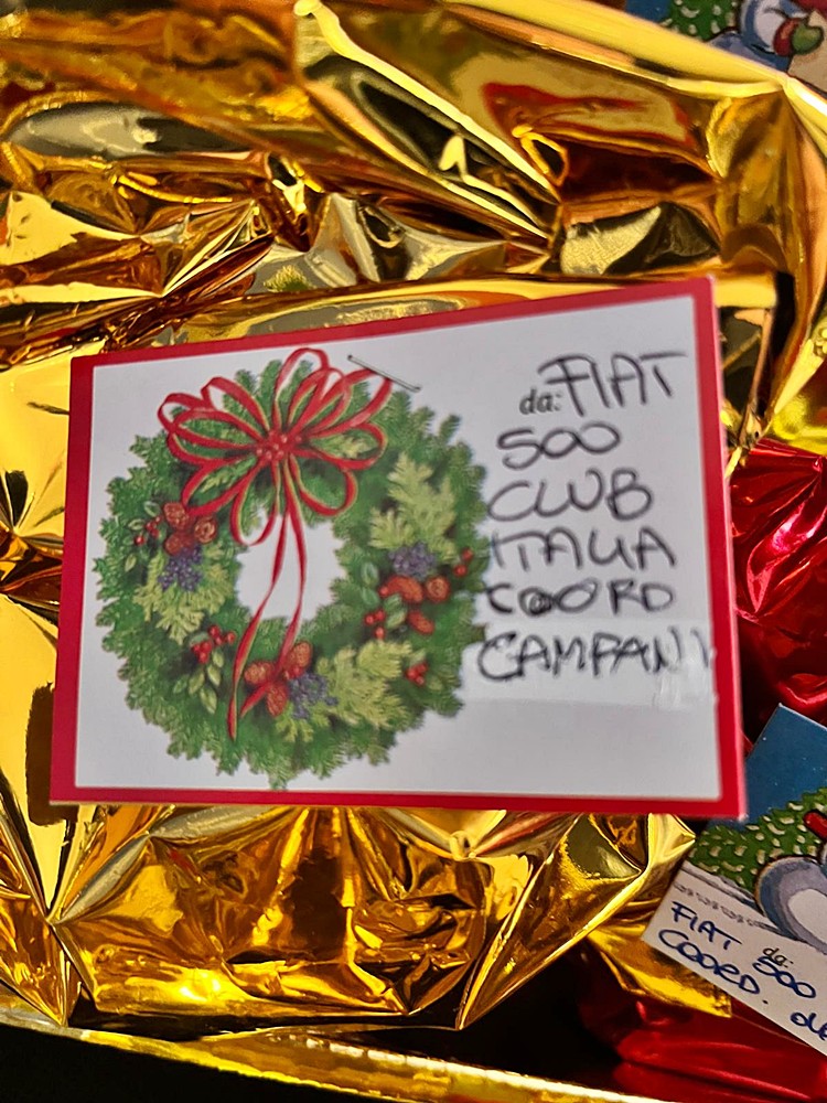 “Ernesto, stiamo organizzando con l’aiuto dei fiduciari campani la Befana in 500 per portare modellini delle nostre auto ai bambini degli ospedali pediatrici con la Fondazione “Santobono-Pausillipon”, abbiamo individuato un modellino interessante, scala 1:24 fatto bene, che ha anche un costo abbastanza alto, di circa 7€, ma il problema è che, nonostante le nostre socie, con Chiara Santoro in testa, si siano sguinzagliate dappertutto, stentiamo a trovarne altri. Quelli che abbiamo sono pochi: magari su Napoli, visitando questa catena di negozi di giocattoli puoi trovarne altri?”.