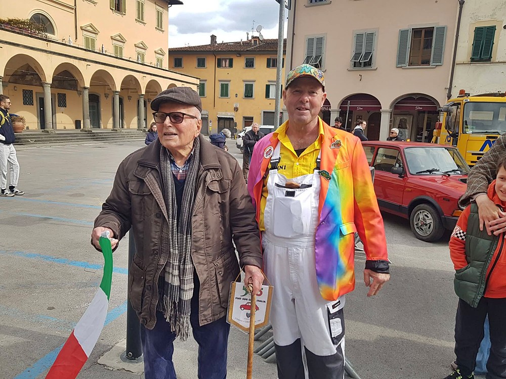 Richiamati i cinquecentisti a gran voce da Giovanni Nocentini, al grido di “Si parte!” con il suo storico megafono, si sono messe in moto un centinaio di 500, coloratissime e variegate. Insieme hanno formato una lunghissima coda e, senza mai staccarsi, hanno percorso la Statale 69 da Piazza Ficino verso il centro di Incisa Valdarno. Oltre a Giovanni, che indossava una giacca variopinta eccezionale, ad abbassare la bandierina di partenza con il tricolore era presente un figlinese DOC di 105 anni, il signor Mario Pampaloni, arzillo come un giovincello di “soli” 70 anni, un uomo dolce e gentile dal cui sguardo traspare un secolo di storia valdarnese, che è stato ben contento di dare il via a questa infinita sfilata di macchine storiche.
