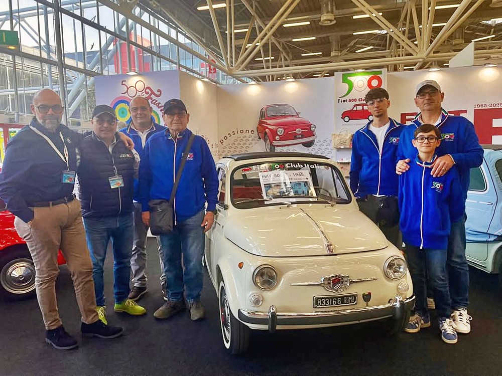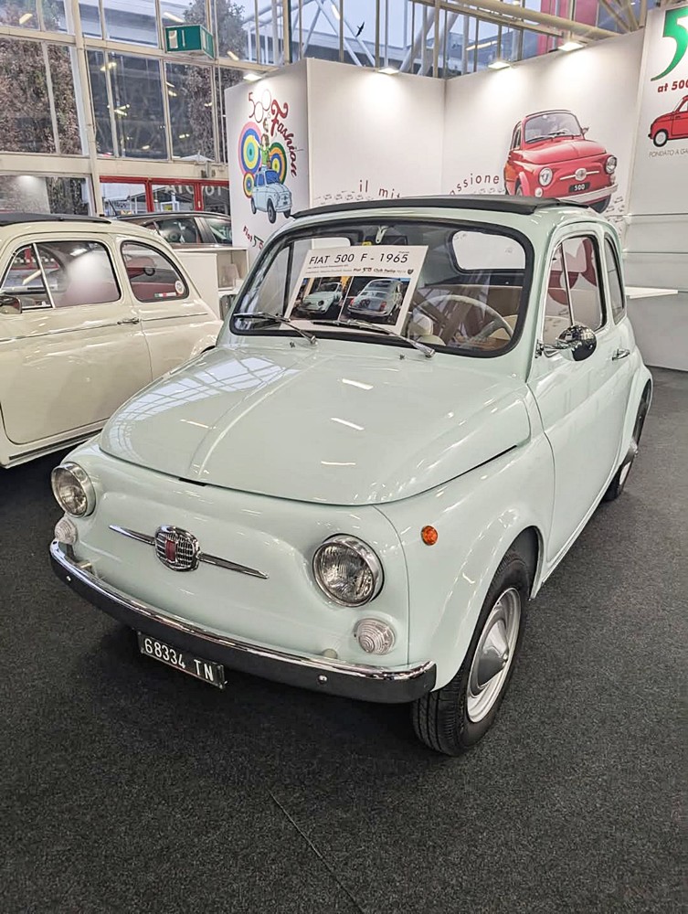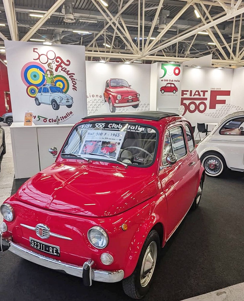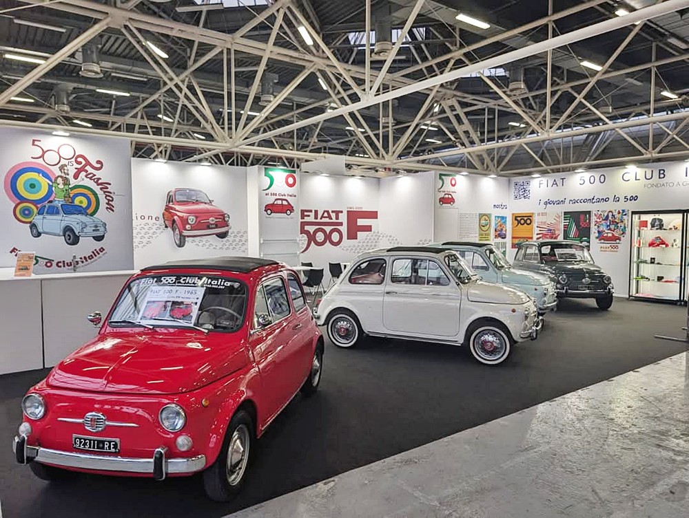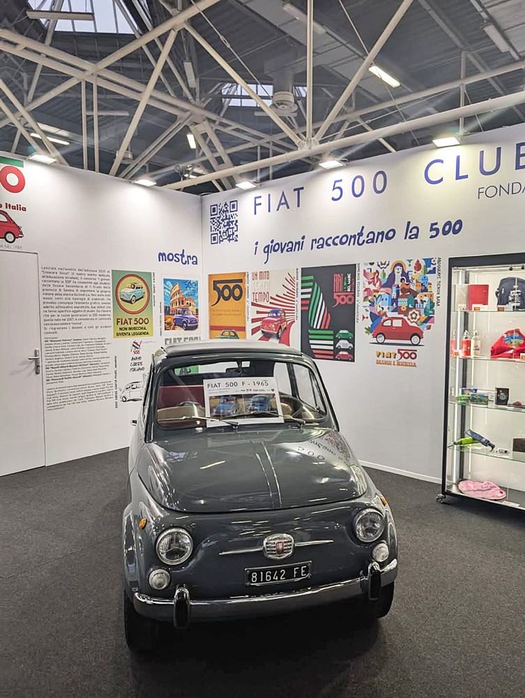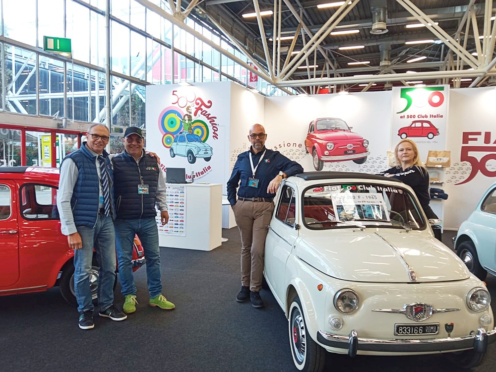 L’allestimento dello stand celebrava i 60 anni della 500 F esponendo 4 500 “8 bulloni” del 1965: la 500 F rossa di Roberto Dall’Asta; la 500 F grigia di Roberto Pini; la 500 F Giannini bianca di Vincenzo Palombi (vedi anche “4PiccoleRuote” novembre/dicembre, pag. 44) presente in fiera con le tre generazioni della sua famiglia con l’abbigliamento customizzato creato per l’occasione; la 500 F acquamarina di Massimo Zucchelli, la cui esposizione nello stand ha fatto nascere un’amicizia tra il proprietario e il socio Giuseppe Chiapatti di Bologna, che la ha custodita nel proprio garage nel giorni precedenti e successivi alla fiera. Ad accogliere soci e visitatori la squadra composta da me, dal vicepresidente Alessandro Vinotti, dal referente regionale per il Veneto Bruno Masato e dal referente regionale per il Lazio Fabio Grosso, affiancati dal presidente onorario Stelio Yannoulis, dal fiduciario Claudio Calzolari e da Elisabetta Tonelli del Coordinamento di Bologna.