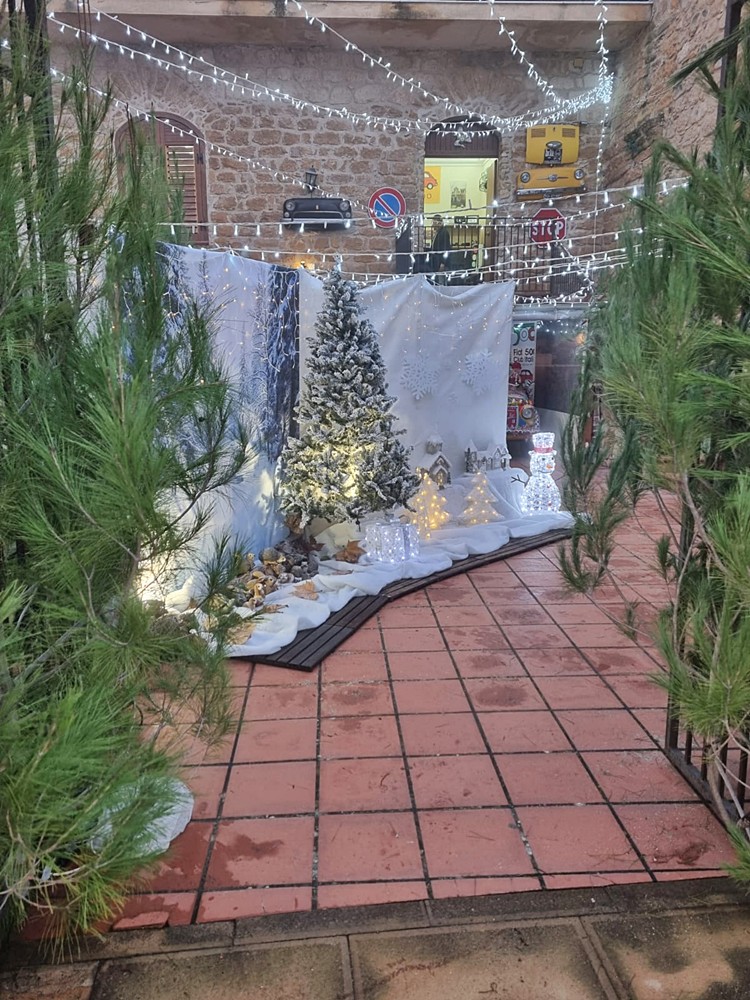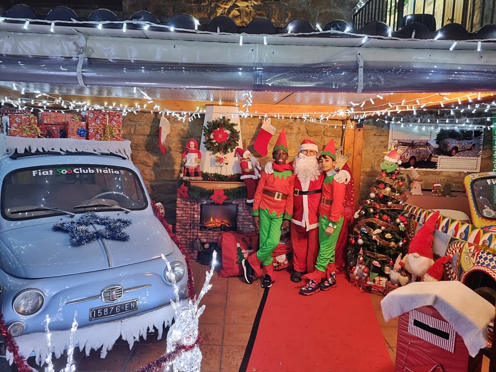 Il percorso verso lo stupore iniziava già dall’ingresso, dominato da un imponente Babbo Natale gonfiabile che introduceva i visitatori in un incantevole bosco innevato. Il cuore pulsante dell’evento è stata la ricostruzione della casa di Babbo Natale: un ambiente caldo con un camino acceso, una scenografica slitta e un originale albero addobbato a tema Grinch, che ha incuriosito e divertito tutti i presenti insieme a simpatici elfi e decorazioni di pan di zenzero. Accanto a questi elementi spiccava una splendida Fiat 500 Giardiniera, perfettamente integrata tra renne luminose e una cascata di pacchi regalo. Un tocco di speciale umanità è stato dato dall’angolo dedicato a Natalina e agli elfi, interpretati con entusiasmo dai bambini del Progetto Sai di Calascibetta e Enna, simbolo di una festa che sa essere anche inclusiva.