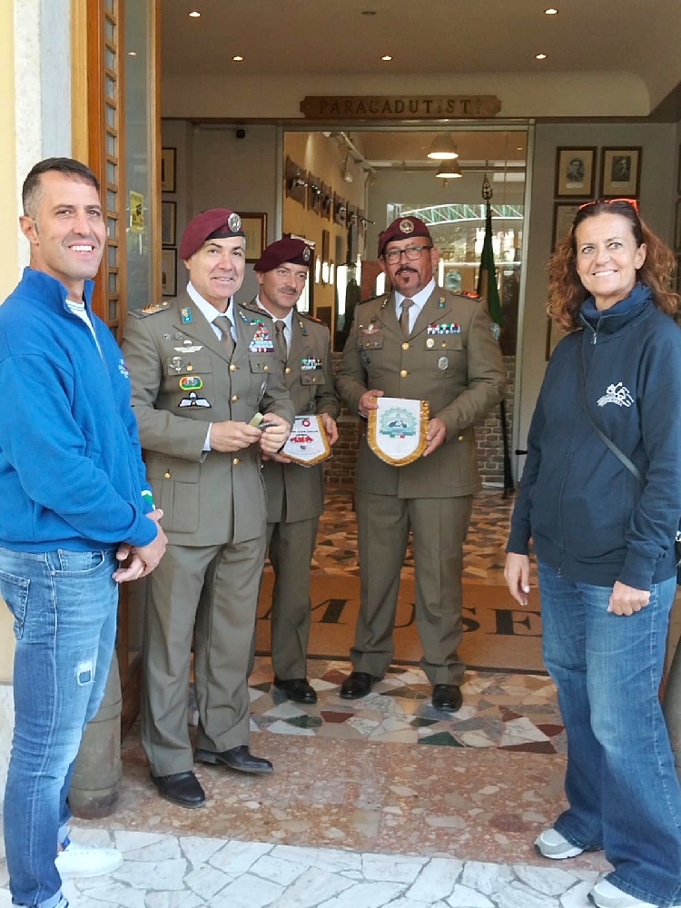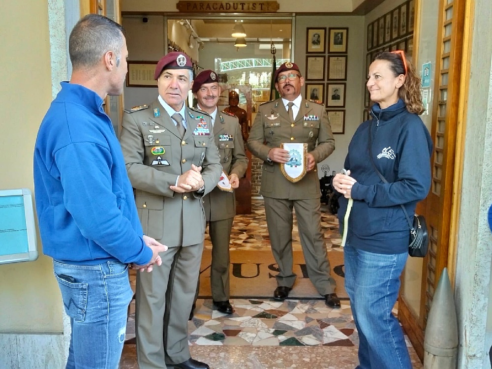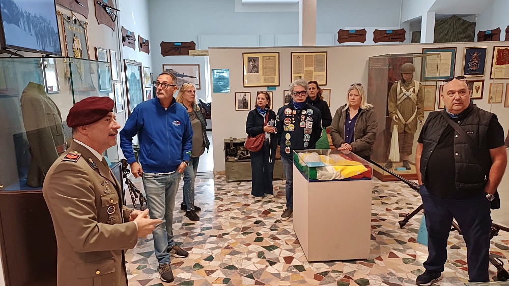 Dopo le foto di rito ed aver consegnato una targa ricordo ai rappresentanti del Centro Trasfusionale, a metà mattinata il corteo formato dalle piccole bicilindriche e dalle Vespa ha attraversato la città della Torre Pendente per raggiungere il Museo Storico dell’Aviotruppe, parcheggiando all’interno della caserma.