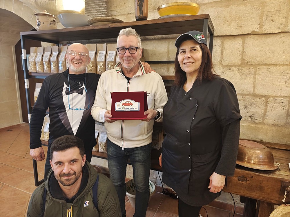 Dopo la colazione siamo ripartiti alla volta della strada dei Cento Santi, in Contrada Pietrapanta, per poter visitare la Cripta situata in una gravina, che era utilizzata come ovile fino alla scoperta, nel 1963, dei bellissimi affreschi e delle nicchie finemente decorate. La visita guidata è stata curata dalla Cooperativa Synchronos che abbiamo ringraziato con un nostro gagliardetto. Sempre in loco abbiamo gustato le specialità della Basilicata presso l’Agriturismo Casal Dragone.