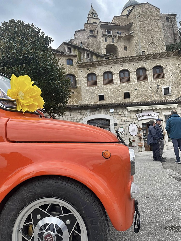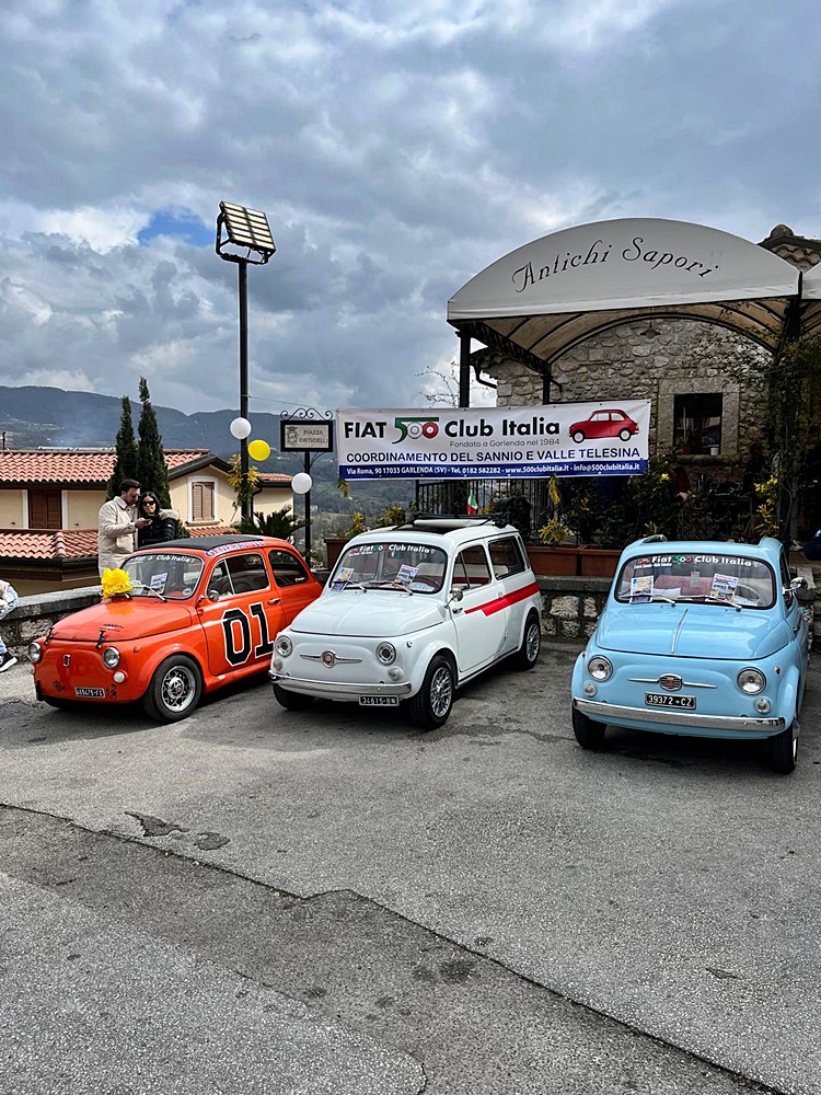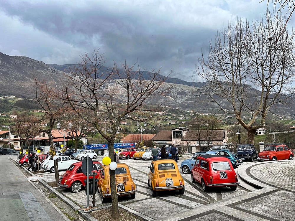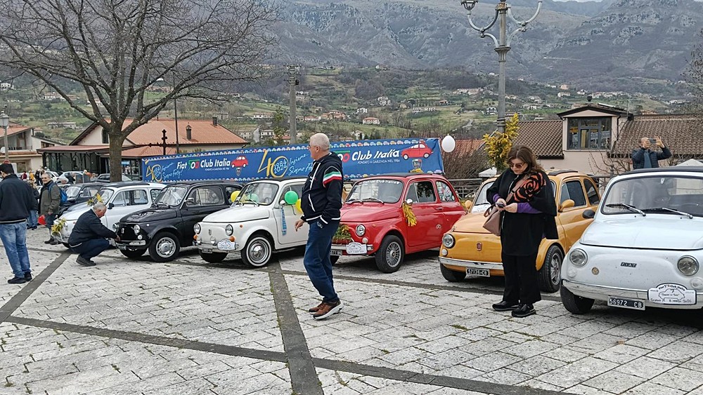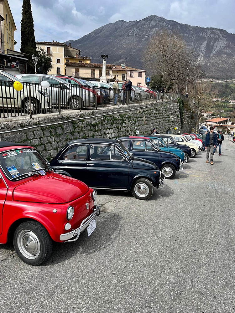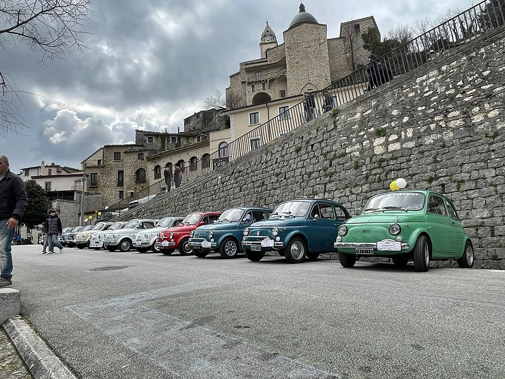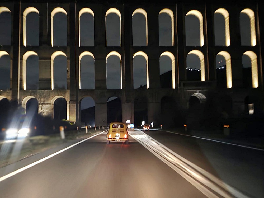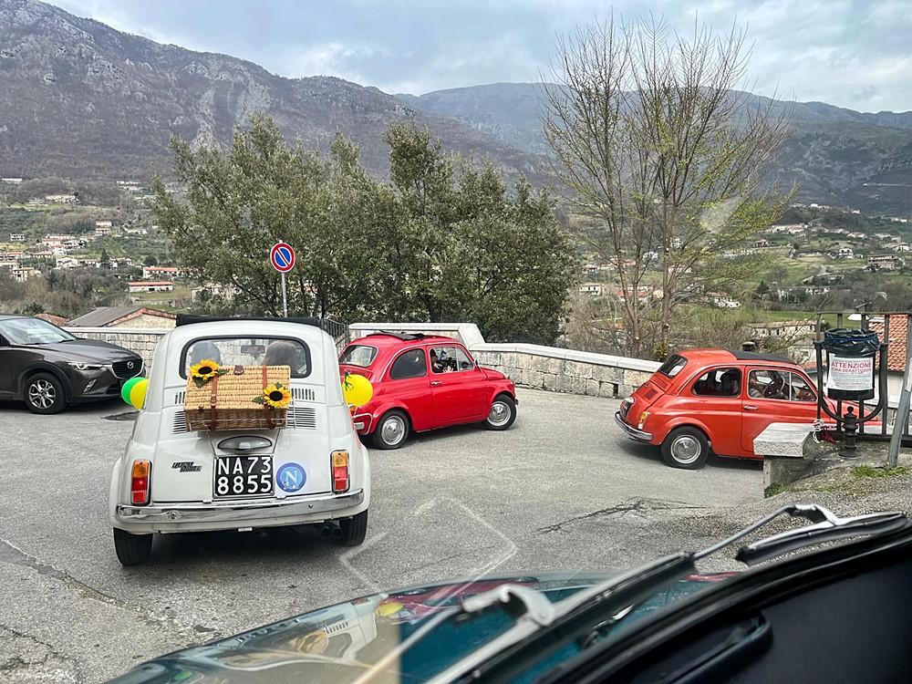Per noi da Napoli, dopo un po’ di autostrade, si entra nel bellissimo paesaggio delle nostre campagne attraverso l’Acquedotto Carolino, splendore architettonico posto quasi come “porta” per l’ingresso nel vero e proprio slow drive fatto di campi, di colline, delle varie coltivazioni e ti viene voglia di aprire il tettuccio, complice il bel tempo, per inebriarti dei profumi della terra delle nostre tradizioni e con quei profumi arrivare alla meta entrando nella Storia. Cusano Mutri è un antichissimo borgo medioevale che conserva intatte le sue case di pietra del centro storico fatto di viuzze (fortunatamente impraticabili alla auto) e di scale, la splendida torre dell’antica città fortificata, purtroppo l’unica rimasta indenne, le antiche porte cittadine e gli angoli nascosti, la splendida chiesa dei Santi Pietro e Paolo con la sua pala d’altare che da sola è un capolavoro per cui vale la pena di venire fin qui. Il tutto illustrato passo passo (o meglio, gradino dopo gradino) dalle due guide locali. Quando si sta così bene, però, purtroppo il tempo vola ed è tiranno, allora tutti in macchina (oltre 50: tante, per un borgo così piccolo) e si parte per il giro per le contrade fino al territorio di Pietraroja, altro posto da visitare, anche se oggi non c’è tempo per il Museo Paleontologico con i resti di “Ciro”, il cucciolo di dinosauro meglio conservato d’Europa. Nel territorio di Pietraroja una bellissima azienda casearia a conduzione familiare ci attende con un gustoso aperitivo e fioccano i primo brindisi, poi tutti a comprare qualche leccornia da portare a casa: caciotta al tartufo locale, caciocavallo e tantissimi tipi di formaggi. Poi ancora in macchina per arrivar alla parte conclusiva di questa splendida giornata: pranzo con specialità locali, un po’ di musica e balli, distribuzione di omaggi, il ritiro della welcome bag sempre gradita e poi, purtroppo, “è subito sera”. Baci, abbracci, saluti e si ritorna a casa di nuovo carichi, passando di nuovo la splendida porta dell’Acquedotto Carolino, illuminato di sera nella bella foto di un socio di Caserta che, dopo una giornata di relax “lontani dal quotidiano” ci riporta alla realtà; domani si ricomincia, in attesa del prossimo raduno, per tirare di nuovo la levetta, risentire il celestiale borbottìo e partire per una nuova avventura.
