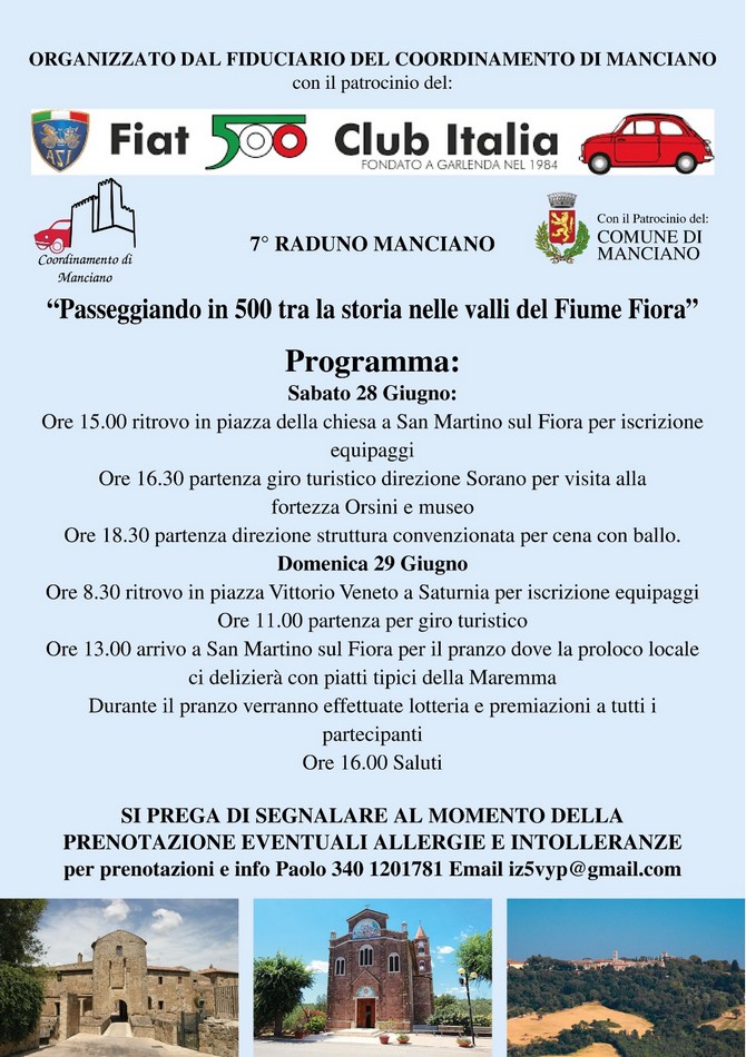 Evento Fiat 500 organizzato dal Coordinamento Manciano – Fiduciario: Paolo Materazzi con il patrocinio del Fiat 500 Club Italia.