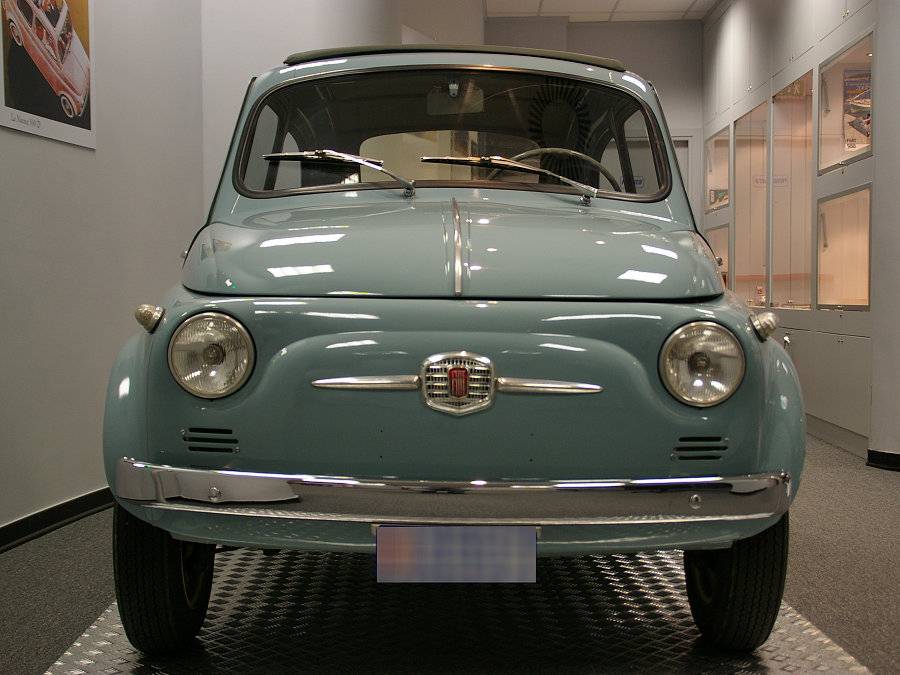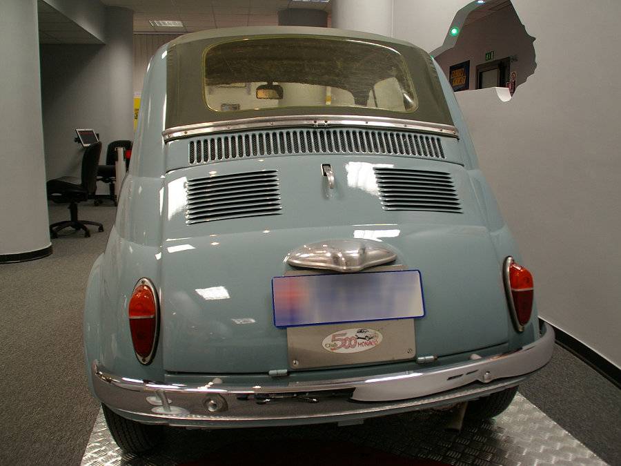 Si tratta di uno dei primissimi esemplari. Da notare all’interno delle portiere l’assenza delle maniglie per far discendere i finestrini (in quanto fissi). Inoltre, la vettura era omologata per due sole persone (la panchetta posteriore – priva di imbottitura – serviva per i bagagli). Ritenuta sin troppo spartana, alla piccola bicilindrica di casa Fiat saranno apportate alcune modifiche atte a renderla più confortevole (vetri discendenti, panca posteriore imbottita) ed esteticamente gradevole (es. molure sulle fiancate, tegolino sui fari anteriori, sigla del modello sul posteriore).