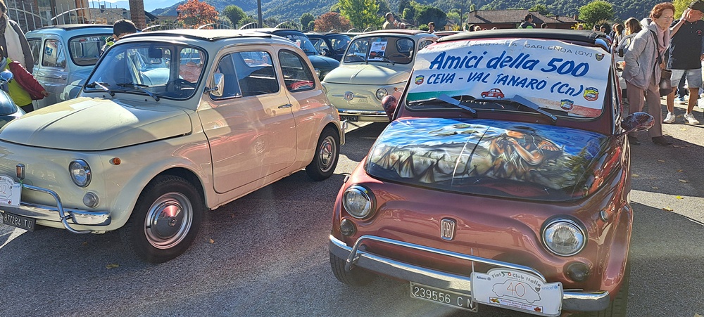 L’ultimo Raduno della stagione 2025 ci porta nei boschi della Valle Maira, e precisamente a Roccabruna di Dronero, e anche questa volta abbiamo avuto l’onore di ospitare un Coordinamento amico, quello di Ceva-Val Tanaro, con il mitico Italo Nardini, che ha portato con sรฉ diversi equipaggi. Raduno, questo, organizzato in modo diverso dal solito: al mattino le 500 sono state esposte alla Fiera di Valle, per poi portarci come da tradizione a Cartignano per rinfresco e premiazioni. Ed รจ da qui che รจ iniziato un tour panoramico, avventuroso e spericolato che sarร  difficile da dimenticare! Attraversando i boschi di Dronero e Montemale, inerpicandoci sulla Piatta fino a Madonna della Neve, ci siamo buttati a capofitto in tornanti vertiginosi incorniciati da castagni secolari per giungere a Valgrana per un meritato banchetto presso il Ristorante Da Beppe. Italo Nardini e Claudio Bernardi hanno avuto modo di saldare la loro amicizia brindando insieme. Il fiduciario di Ceva รจ una presenza costante e sempre di aiuto, con consigli e presenza, giร  dal primissimo raduno organizzato dal nostro Coordinamento a maggio 2022. Con la pancia piena non restava che tornare a far ammirare le nostre piccoline al numeroso pubblico che nel pomeriggio sceglie di visitare la Gran Castagnata, prima di salutarci e prometterci di condividere nuove avventure nel prossimo anno.