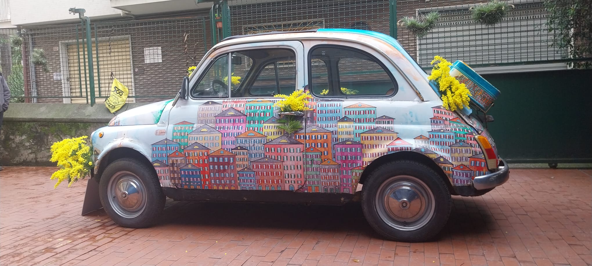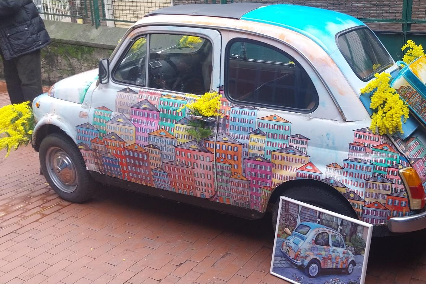 Il socio Angelo Gnecco ha donato al Museo Multimediale della Fiat 500 di Garlenda una delle sue famose macchine decorate con case e vedute di Genova.