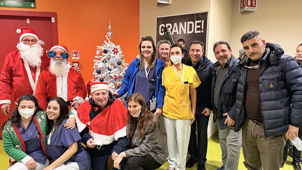 L’arrivo al parcheggio dell’ospedale San Gerardo non รจ stato esattamente fatto in โsordinaโ, ma si sa che le 500 sono โcaciaroneโ e portano sempre allegria con i loro colori e rumori. Una volta sistemate le nostre macchinine, siamo saliti in reparto e ci siamo accomodati nell’atrio antistante l’ingresso delle stanze di ricovero; diligentemente abbiamo iniziato a sistemare sotto l’albero i sacchi contenenti regali offerti sia dal gruppo Sogim di Monza che dal Palo di Milano, oltre a quelli che i 40 equipaggi hanno voluto donare come pensiero personale rivolto ai bambini e le loro famiglie che stanno attraversando ora un momento di difficoltร sanitaria e per lasciare un giocattolo anche agli altri bambini che durante l’anno, purtroppo, dovranno transitare da questa struttura per le proprie cure in modo da rendere meno tristi quei momenti.