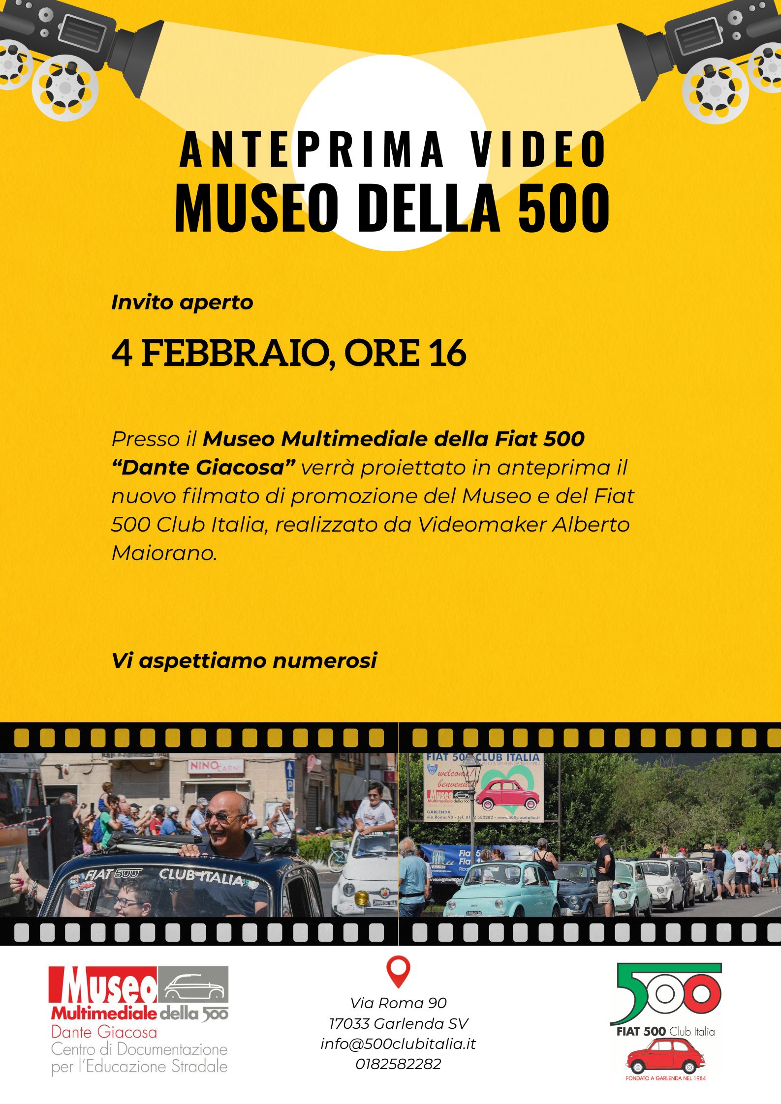 Martedì 4 febbraio alle ore 16, presso il Museo Multimediale della Fiat 500 “Dante Giacosa”, verrà presentato in anteprima il nuovo video di promozione del Museo e del Fiat 500 Club Italia. Il progetto, realizzato dal videomaker Alberto Maiorano, nasce con l’obiettivo di raccontare in modo emozionante e coinvolgente la